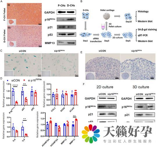 由于p16INK4a在 D-CHs 中顯著上調,因此測試了抑制 p16INK4a是否可以逆轉 D-CHs 中的 OA 表型(圖1 B)。結果表明,在 2D 軟骨細胞培養(yǎng)上,sip16INK4a處理顯著降低 p16INK4a水平(圖1 F),并部分逆轉衰老水平(圖1 C、D)。但是,p16INK4a 抑制的 D-CH 顆粒在軟骨生成刺激下無法產生軟骨(圖1 E),盡管軟骨生成基因水平沒有顯著受損(圖1 D)。此外,抑制 p16INK4a促進了 MMP13 的表達(圖1 D、F)。這說明,在 D-CHs 中抑制 p16INK4a不會增強 D-CHs 在體外生成健康軟骨的能力。