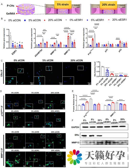 考慮到 ERα 對軟骨細胞衰老和軟骨形成表型的影響,以及其對機械負荷的反應,實驗還研究了 ERα 在調節(jié)壓縮負荷對軟骨細胞表型的影響中的作用。結果顯示,當存在 ESR1 表達時,20% 應變下的機械負荷不再引起先前看到的 p16INK4a和 MMP13 表達的增加。相反,敲低 ESR1 表達時施加機械負荷會降低這兩種分子的表達(圖2 B、D-F)。值得注意的是,機械負荷和 ESR1 敲低都增加了 P-CHs 中磷酸化的 p65(pho-p65)的水平,這是細胞應激的代表性標志物。這些數據說明,抑制 ERα 會改變軟骨細胞對壓縮負荷的反應性。