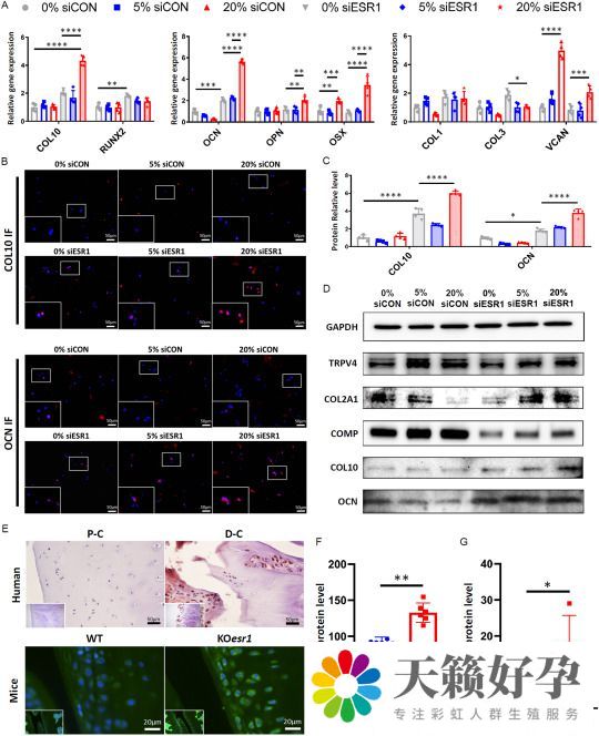 最后,實驗進一步研究了機械負荷和 ERα 表達在調節(jié)軟骨生成、纖維化和成骨基因中的相互作用。當 ESR1 表達保留(siCON)時,5% 和 20% 應變下的機械負荷對成骨或纖維化標記基因的表達沒有顯著影響,盡管 OSX 和 VCAN 在 20% 壓縮應變下顯著上調(圖3 A)。然而,COL2A1 存在應變反應性的下調(圖3 D)。有趣的是,單獨敲除 ESR1 (0% siESR1)顯著上調了 OCN 的表達,同時抑制了 COL2A1 和軟骨寡聚基質蛋白(COMP) 的水平(圖3 A-D)。雖然 5% 的應變壓縮負荷對 ESR1 敲除沒有緩解作用,但20% 的應變傾向于進一步上調肥大相關標志物,包括 COL10 和 OCN(圖3 B-D),同時還逆轉了 ESR1 敲除對 COL2A1 和 COMP 水平的抑制作用(圖3 D)。值得注意的是,與 P-CHs 相比,在人類的 D-CHs 中也觀察到 OCN 水平的提高(圖3 E、F),并且與野生型對照相比,在從 ESR1 敲除小鼠中分離的軟骨中也觀察到 OCN 水平增強(圖3 E、G)。這說明,ERα 的缺失和壓縮超負荷協(xié)同增加軟骨細胞的肥大轉化。